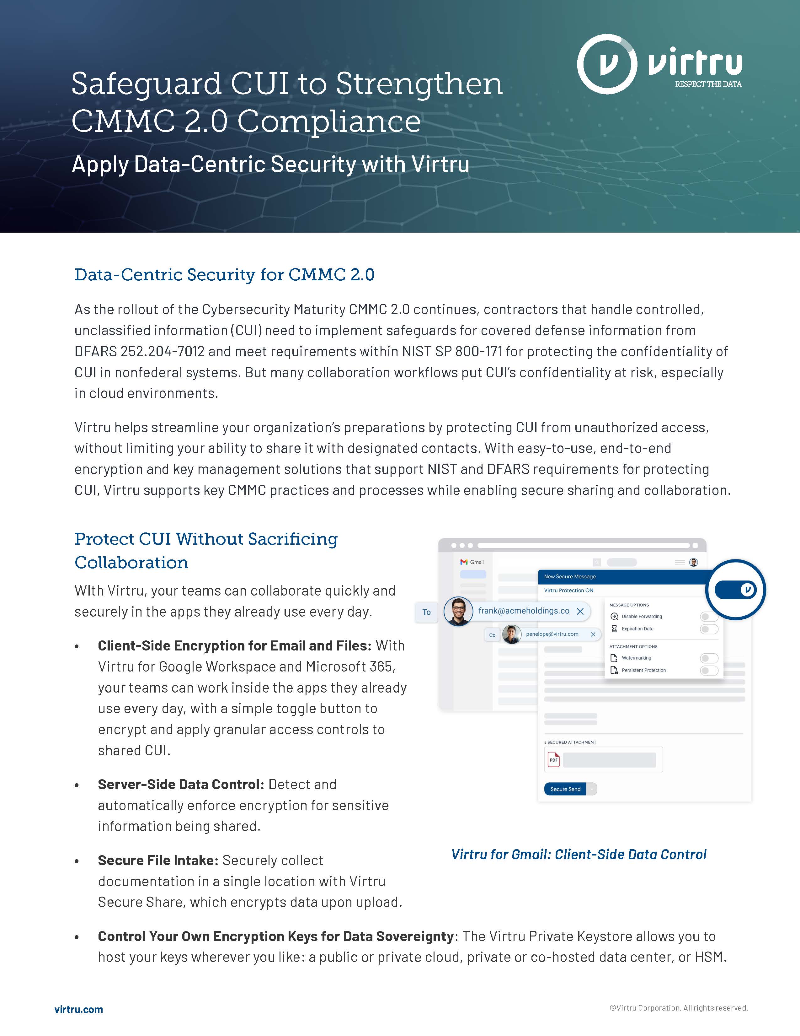 See how Virtru can equip your organization with data-centric security for CMMC 2.0: Book a demo with our team.
